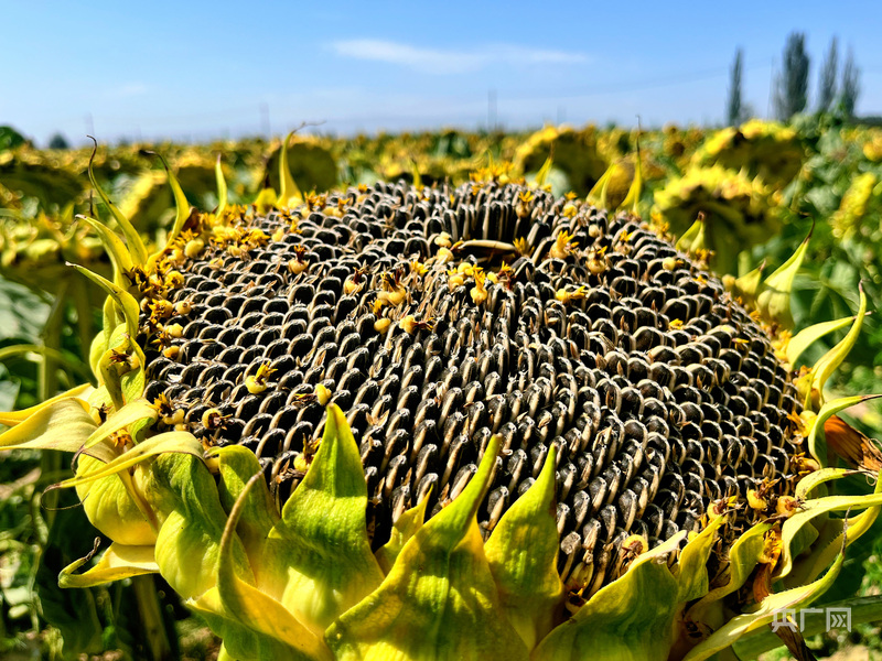 初秋時節(jié),內(nèi)蒙古阿拉善盟阿拉善左旗溫都爾勒圖鎮(zhèn)巴潤霍德嘎查的1.3萬畝葵花迎來豐收。田間地頭,農(nóng)戶們正忙碌地收割、插盤、晾曬,一片喜人景象。沉甸甸的葵花盤壓彎枝頭,顆粒飽滿、色澤金黃,不僅映襯出豐收的喜悅,更照亮了當?shù)厝罕娫鍪罩赂坏摹敖鹕贰薄?/p>