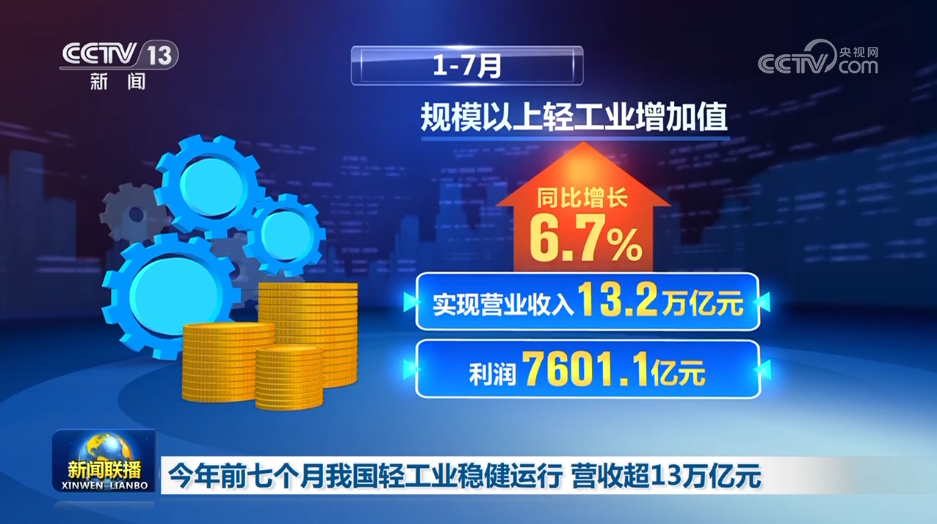 中國(guó)輕工業(yè)聯(lián)合會(huì)數(shù)據(jù)顯示,今年前七個(gè)月,在擴(kuò)內(nèi)需、促消費(fèi)政策支持下,我國(guó)輕工業(yè)運(yùn)行穩(wěn)健,生產(chǎn)、營(yíng)收、市場(chǎng)規(guī)模均保持良好態(tài)勢(shì)。規(guī)模以上輕工業(yè)增加值同比增長(zhǎng)6.7%,實(shí)現(xiàn)營(yíng)業(yè)收入13.2萬億元、利潤(rùn)7601.1億元。