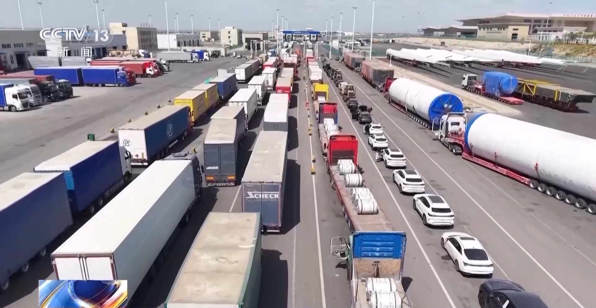 總臺(tái)央視記者 李廈:這里是霍爾果斯公路口岸,看我身邊龐大的車(chē)流,不僅有滿載跨境包裹的大貨車(chē)、更是有一眼望不到頭的國(guó)產(chǎn)新能源車(chē)和農(nóng)用機(jī)械車(chē)輛,甚至還有長(zhǎng)達(dá)數(shù)十米的風(fēng)機(jī)葉片,這些琳瑯滿目的中國(guó)好貨,正在24小時(shí)不停歇地從這條黃金大通道駛出國(guó)門(mén)。