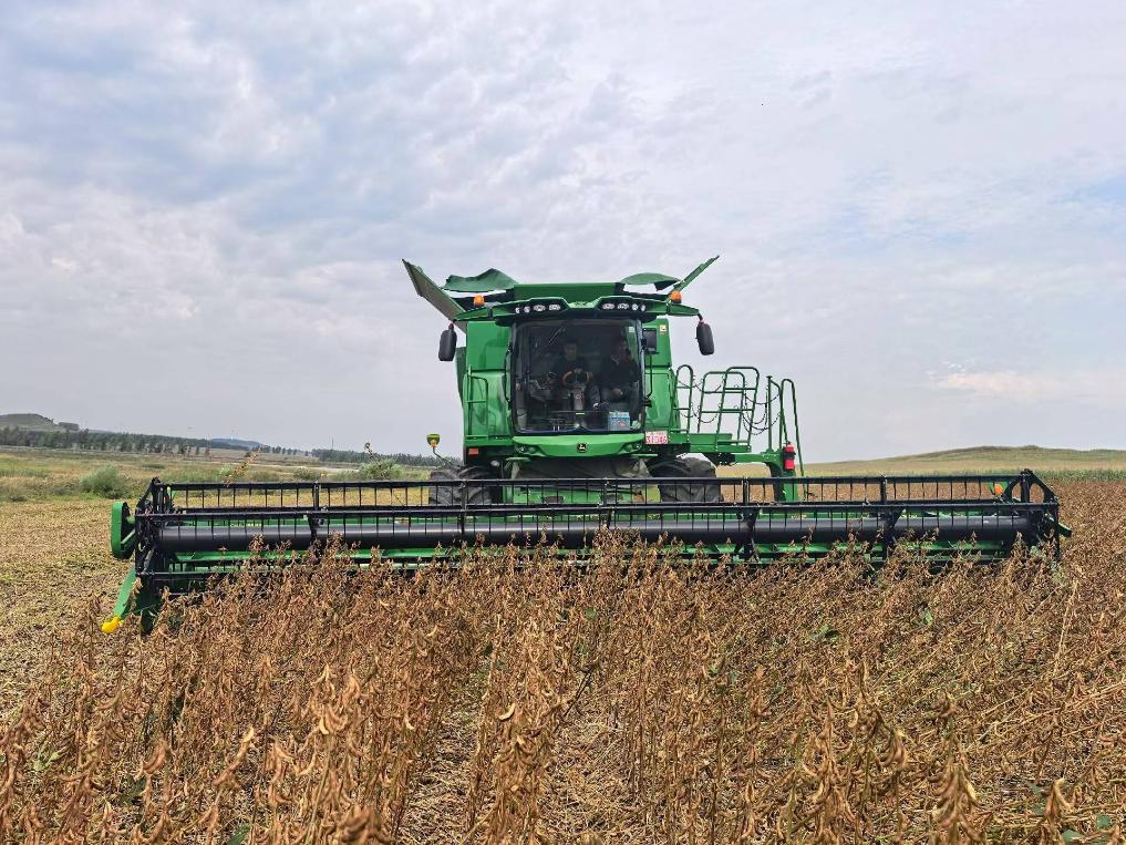在黑龍江省七臺(tái)河市勃利縣恒山玉米專業(yè)合作社的一處地塊,一臺(tái)臺(tái)大型收割機(jī)往來(lái)穿梭,一排排飽滿的大豆植株被精準(zhǔn)卷入機(jī)身,金黃的豆粒隨即通過(guò)出糧口涌入運(yùn)糧車(chē)。