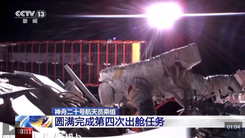 出艙活動期間,航天員陳中瑞、王杰完成了空間站空間碎片防護裝置安裝、艙外設備設施巡檢等任務,這是首次由兩名第三批航天員共同完成艙外作業(yè)任務。截至目前,神舟二十號航天員乘組已完成四次出艙活動,成為我國執(zhí)行出艙任務次數(shù)最多的乘組之一。
