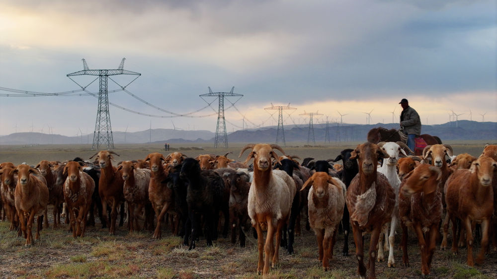 7月6日,在位于新疆昌吉回族自治州木壘哈薩克自治縣的±1100千伏昌吉-古泉特高壓直流輸電線路下,新疆送變電公司員工開展線路巡視,近處成群的羊在草地悠然覓食。