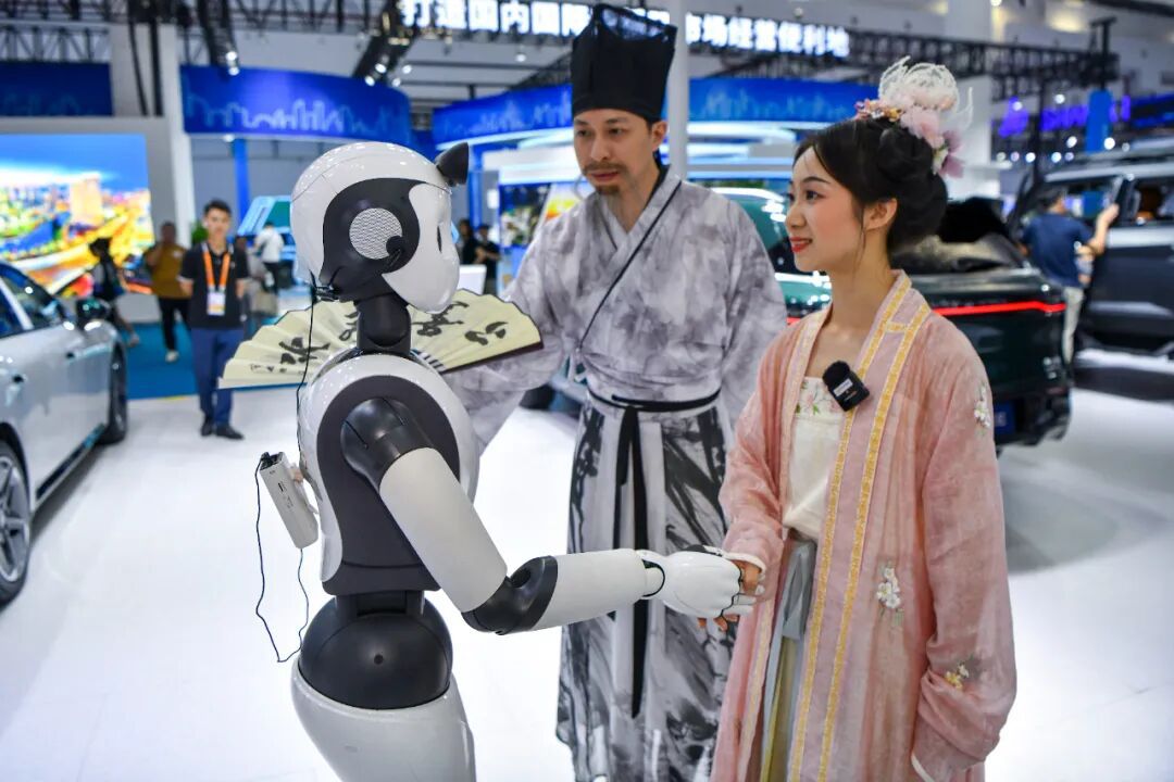 2024年4月15日,海南海口,第四屆中國國際消費(fèi)品博覽會上,身著漢服的參觀者與“柔美人形智能服務(wù)機(jī)器人”互動。中新社記者 駱云飛 攝