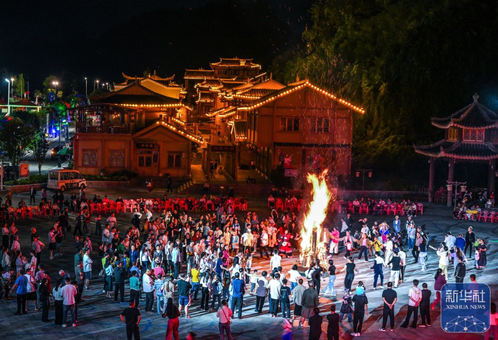 ↑ 10月5日晚,在貴州省晴隆縣阿妹戚托小鎮(zhèn),游客與當?shù)厝罕妵艋鸸参琛P氯A社記者 楊文斌 攝