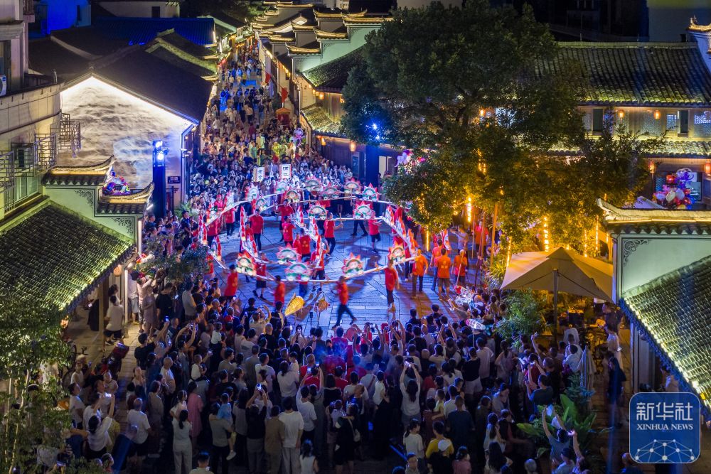 ↑ 10月5日,游客在浙江省浦江縣東街歷史文化街區(qū)欣賞板凳龍巡游(無人機照片)。新華社發(fā)(張輝攝)