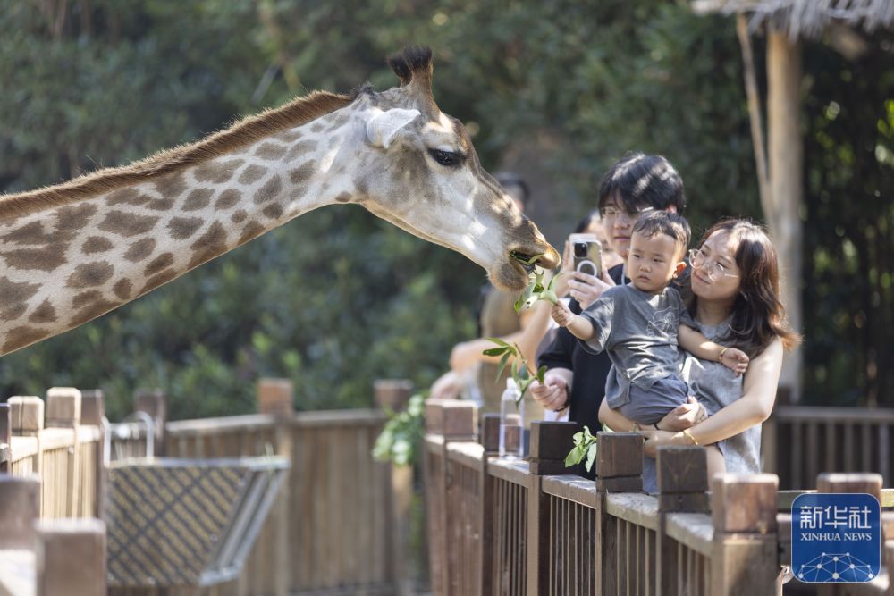 ↑ 10月6日,小朋友在上海野生動物園與長頸鹿互動。新華社記者 王翔 攝