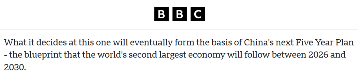 10月20日至23日,黨的二十屆四中全會在北京舉行。對此,英國廣播公司(BBC)19日報道認為,“此次會議所作的決定最終將成為中國下一個五年規(guī)劃的基礎(chǔ),而這一規(guī)劃將指引世界第二大經(jīng)濟體在2026年至2030年期間的發(fā)展方向”。