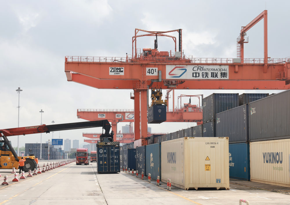 龍門吊不斷起降、轉運卡車川流不息、火車汽笛聲悠揚,各色的集裝箱整齊排放,“陸海新通道”的圖標引人注目……重慶國際物流樞紐園區(qū)到處活力涌動。