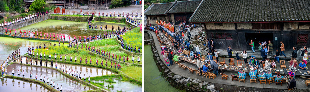 左圖:近期,人們?cè)诶杵娇h肇興侗寨的田園里演唱侗族大歌(黎平縣委宣傳部供圖);右圖:這是2023年拍攝的十八洞村長(zhǎng)桌宴(湘西州委宣傳部供圖)。