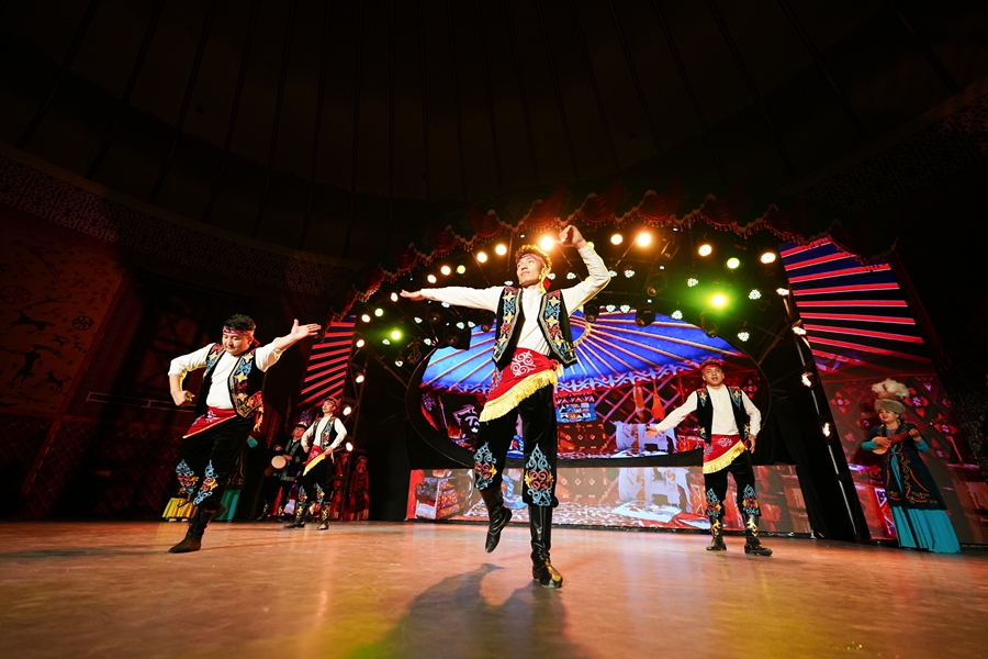 演員在位于新疆阿圖什市的瑪納斯史詩大劇院為游客演繹《瑪納斯》(2025年4月22日攝)。新華社記者 徐宏巖 攝