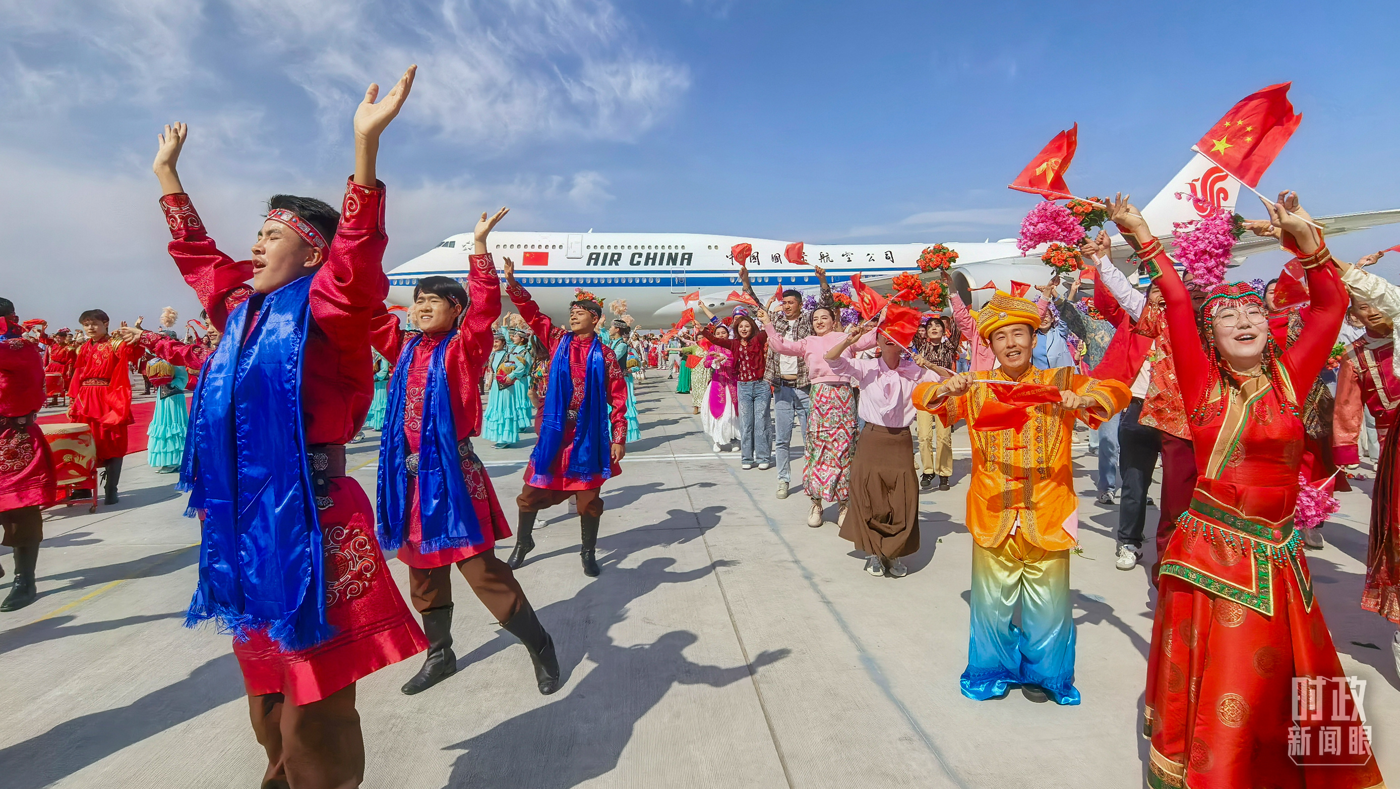 23日下午,烏魯木齊天山國(guó)際機(jī)場(chǎng)鼓樂(lè)喧天。總書記乘坐的專機(jī)在機(jī)場(chǎng)降落,等候在停機(jī)坪的新疆各族各界群眾熱烈歡呼。