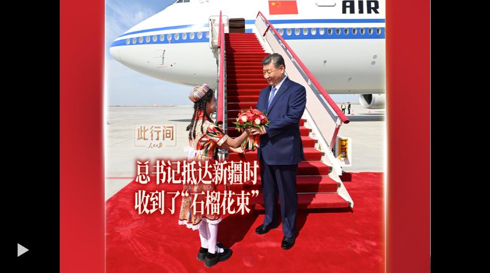 習(xí)近平率中央代表團(tuán)23日下午乘專機(jī)抵達(dá)烏魯木齊,出席新疆維吾爾自治區(qū)成立70周年慶?;顒?dòng),新疆各族群眾在機(jī)場(chǎng)熱烈歡迎??倳浭盏降幕ㄊ铮b點(diǎn)了美麗的石榴。如今,“石榴籽”的妙喻為人熟知,民族團(tuán)結(jié)觀念深入人心。