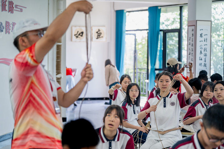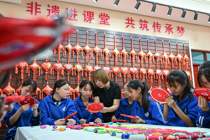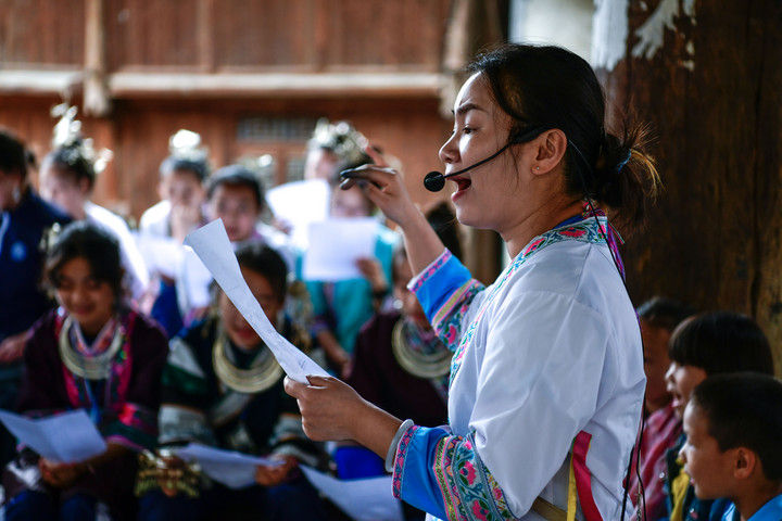 2025年9月26日,內(nèi)蒙古興安盟科右中旗巴彥呼舒第六中學(xué)美術(shù)教師、非遺代表性傳承人吳斯琴(左四)指導(dǎo)學(xué)生刺繡。近年來(lái),內(nèi)蒙古興安盟科爾沁右翼中旗巴彥呼舒第六中學(xué)將當(dāng)?shù)貒?guó)家級(jí)非遺圖什業(yè)圖刺繡引入校園,開(kāi)設(shè)校本課程,并成立興趣社團(tuán),在豐富校園文化生活的同時(shí),讓學(xué)生們近距離感受非遺的魅力,弘揚(yáng)和傳承中華優(yōu)秀傳統(tǒng)文化。隨著國(guó)產(chǎn)動(dòng)畫(huà)電影《哪吒之魔童鬧?!凡粩嗨⑿轮袊?guó)影史票房紀(jì)錄,參與電影配樂(lè)的貴州省榕江縣三寶侗寨的楊想妮和“舞樂(lè)蟬歌”團(tuán)隊(duì)為更多人所熟知。樂(lè)團(tuán)成員懷揣“用音樂(lè)傳遞侗族文化,讓世界聽(tīng)見(jiàn)侗族大歌”的共同夢(mèng)想,將侗族大歌推向更廣闊的舞臺(tái)。這是2025年4月22日,楊想妮在貴州省黎平縣肇興鎮(zhèn)廈格侗寨教前來(lái)研學(xué)的孩子們唱侗歌。