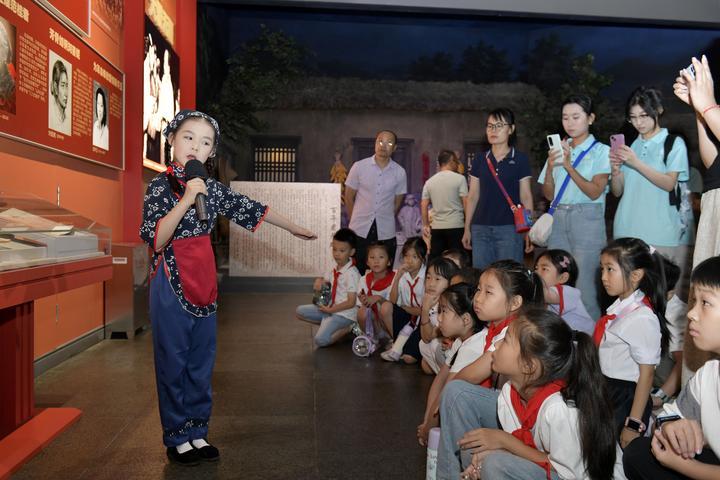 2025年8月7日,在山東省臨沂市沂蒙革命紀(jì)念館,沂蒙紅孩子文藝先鋒隊(duì)的房沫昕在講述紅色故事《沂蒙紅嫂祖秀蓮》。2024年9月,位于沂蒙革命老區(qū)的山東省臨沂市以“傳承沂蒙精神”為宗旨組建沂蒙紅孩子文藝先鋒隊(duì),通過(guò)歌舞、朗誦、故事講述、舞臺(tái)劇等紅色主題文藝節(jié)目,增強(qiáng)紅色文化感染力,不斷為紅色基因代代相傳注入新生力量。2025年5月12日,云南省昭通市威信縣第一中學(xué)學(xué)生在大屏上紅色研學(xué)實(shí)踐基地體驗(yàn)編織草鞋。200余名學(xué)生在紅色研學(xué)實(shí)踐基地親手編織草鞋、制作蠟染,并參觀了扎西會(huì)議舊址、紅軍長(zhǎng)征過(guò)云南情景體驗(yàn)館,在實(shí)踐互動(dòng)中重溫紅色革命歷史。威信縣立足紅色文化資源優(yōu)勢(shì),先后建成扎西會(huì)議紀(jì)念館、紅軍長(zhǎng)征標(biāo)語(yǔ)館等紅色文化展館,以舊址遺跡為“教室”,以文物史料為“教材”,設(shè)計(jì)開(kāi)發(fā)多門(mén)精品研學(xué)課程和線路,在深入開(kāi)展紅色研學(xué)系列活動(dòng)中傳承紅色基因。