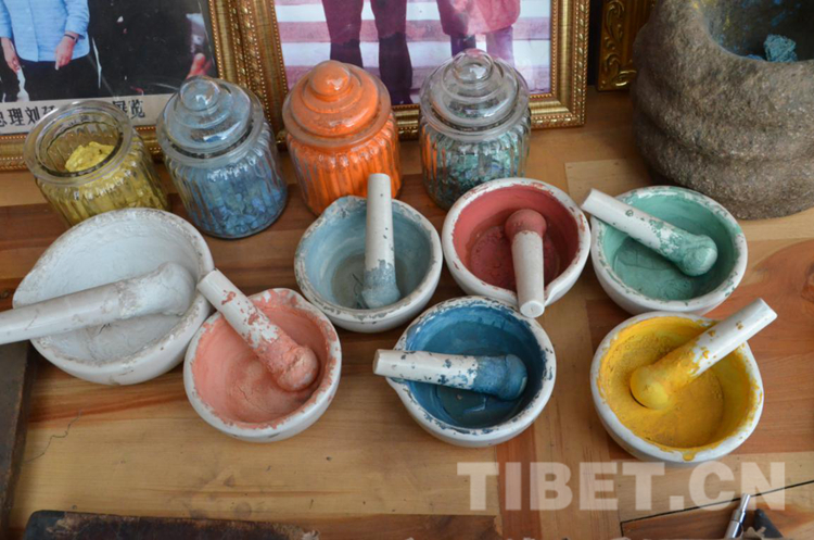 在門口的桌上,西熱秋久拿起一本泛黃的藏書籍向我們介紹,這是家中祖祖輩輩流傳下來(lái)的“繪畫標(biāo)準(zhǔn)”,里面記載了各類造像的比例。在學(xué)習(xí)繪制唐卡時(shí),必須從造像的經(jīng)典比例入手,對(duì)人體結(jié)構(gòu)有所了解后,再開始衣飾形象的臨摹訓(xùn)練,期間需要學(xué)習(xí)畫布、毛筆的制作,礦、植物顏料的研磨、泡制、使用等技巧。