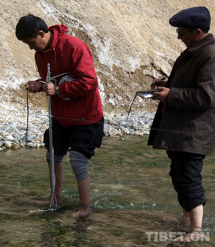 這是時(shí)任雙湖特別區(qū)副區(qū)長王暉(左)和區(qū)委書記珠巨(右)在測量建設(shè)中的水電站流速(王暉提供,2007年攝)