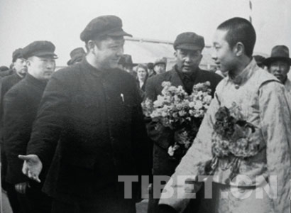圖為1951年4月22日,習(xí)仲勛(前左)率領(lǐng)西北軍政代表熱烈歡迎途經(jīng)西安赴北京的十世班禪(前右)圖片來源:《中國(guó)西藏》雜志