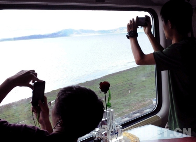這是京藏列車通過西藏錯那湖時,旅客們紛紛用手機拍攝美景(唐召明2012年8月12日攝)