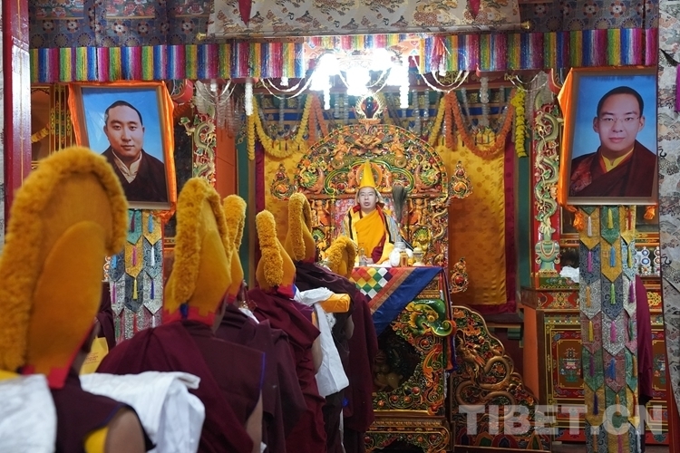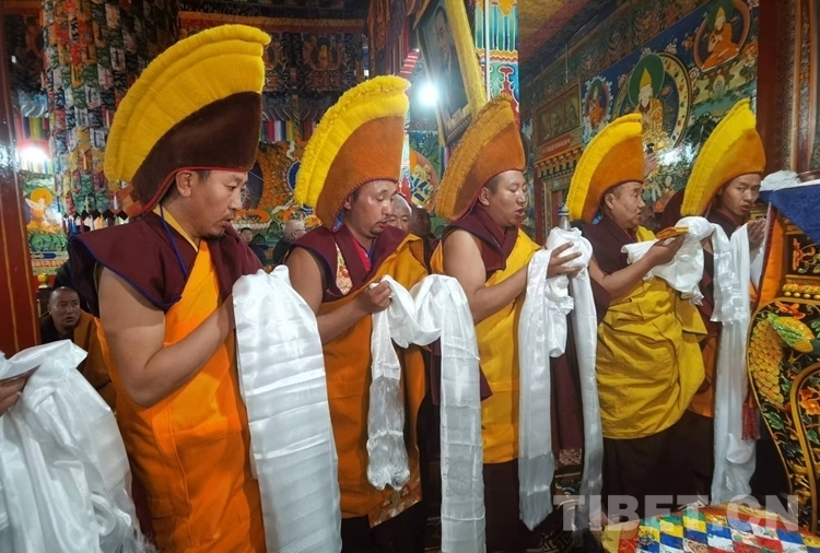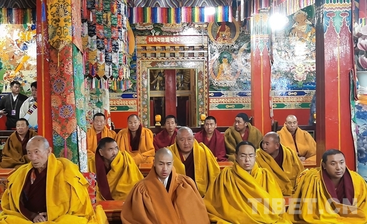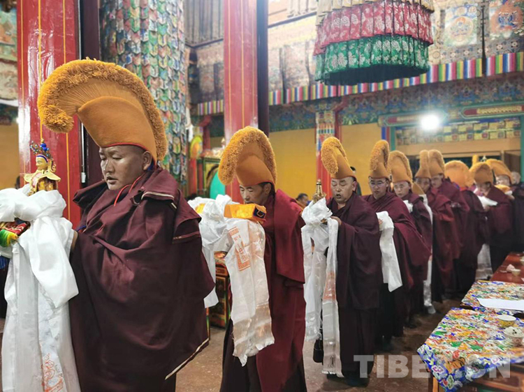 當(dāng)日的拉定寺裝飾一新,班禪一行抵達(dá)后,現(xiàn)場(chǎng)法號(hào)齊鳴、法螺合奏,倫珠晉巴和僧眾在寺廟前舉行了隆重的歡迎儀式。隨后,在手持香爐、寶傘高僧的引導(dǎo)護(hù)送下,班禪步入主殿上寶座,向寺廟僧眾傳授《三主要道論》,為僧眾摸頂賜福、發(fā)放布施。