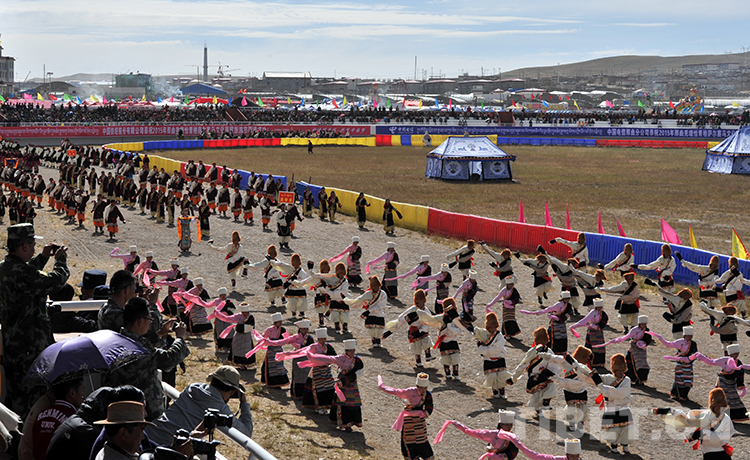 來自那曲地區(qū)(現(xiàn)那曲市)各縣代表隊在進(jìn)行入場式表演。當(dāng)日,那曲賽馬節(jié)在藏北首府那曲鎮(zhèn)開幕(唐召明2013年8月10日攝)