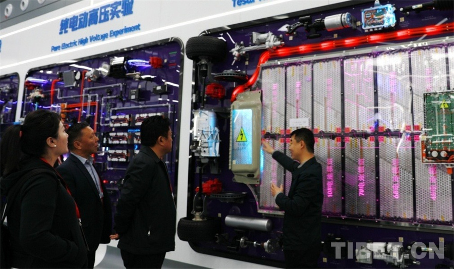 “這是由7104節(jié)電池組成的特斯拉的電池組,它是402伏的高壓電。所以,沒有經(jīng)過專業(yè)培訓進行電動汽車維修會有一定的危險性?!北狈絿H汽車教育展廳、車間負責人黨超為到訪的西藏自治區(qū)工商聯(lián)民營企業(yè)家赴京學習參觀團一行詳細介紹著墻上展示的電池組。大家聽得津津有味。