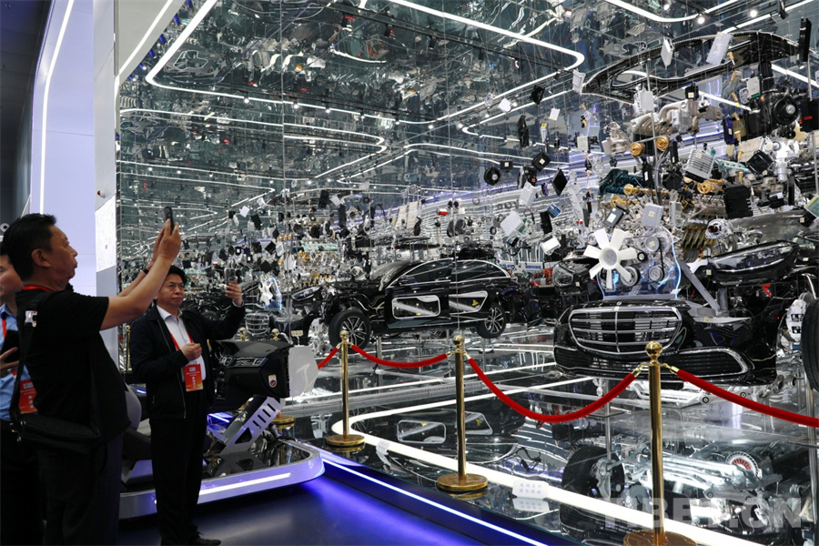 圖為西藏自治區(qū)工商聯(lián)民營企業(yè)家赴京學習參觀團一行在北方國際汽車教育拍攝奔馳整車吊裝爆炸式工業(yè)藝術(shù)展示 攝影:劉莉