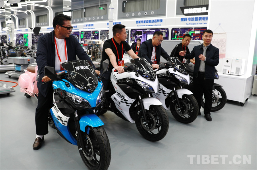 圖為西藏自治區(qū)工商聯(lián)民營企業(yè)家赴京學習參觀團一行體驗氫能摩托車 攝影:劉莉