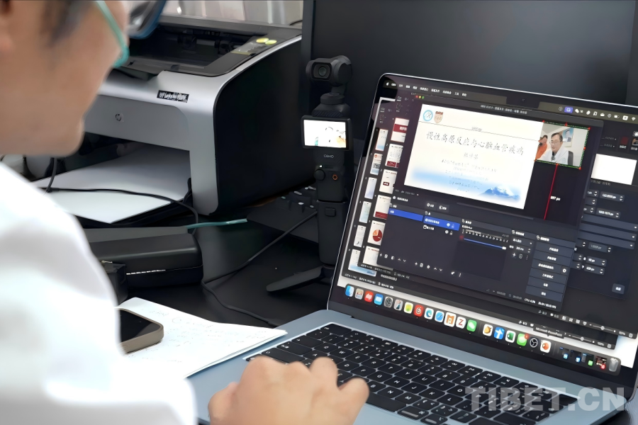 在阿里地區(qū)人民醫(yī)院的行政樓辦公室內(nèi),來(lái)自上海華山醫(yī)院神經(jīng)外科、作為第25批“博士服務(wù)團(tuán)”成員援藏的主治醫(yī)師杜倬嬰,正專注研究一項(xiàng)“新技術(shù)”。桌面上,一臺(tái)口袋相機(jī)運(yùn)行著,旁邊電腦屏幕上同步顯示相機(jī)所拍攝的畫(huà)面,同時(shí)呈現(xiàn)的還有一份關(guān)于高原反應(yīng)與心腦血管疾病的課程講義?!斑@是一套直播系統(tǒng),不過(guò)我現(xiàn)在還在學(xué)習(xí)怎么使用?!爆F(xiàn)任阿里地區(qū)人民醫(yī)院黨委委員、副院長(zhǎng)的杜倬嬰笑著展示初見(jiàn)雛形的成果。