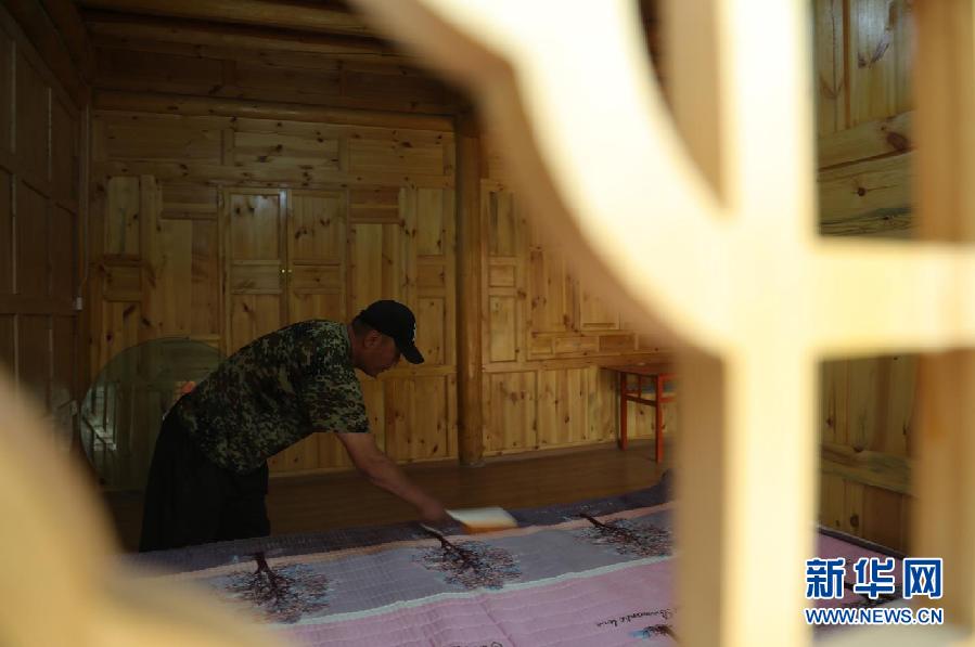 6月4日,在青海省海南藏族自治州貴德縣尕讓鄉(xiāng)松巴村,村民在整理農(nóng)家樂(lè)床鋪。新華社 央秀達(dá)珍 攝