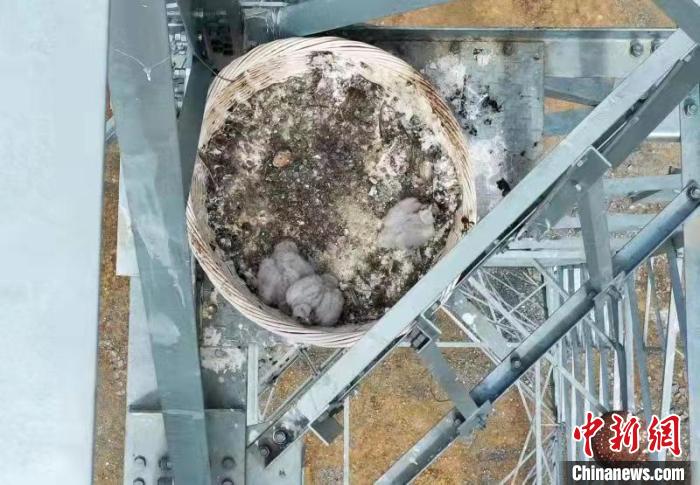 圖為國網(wǎng)青海檢修公司員工在青藏聯(lián)網(wǎng)工程線路鐵塔上加裝的人工鳥窩中成功孵出了幼鷹。朱毅然 攝
