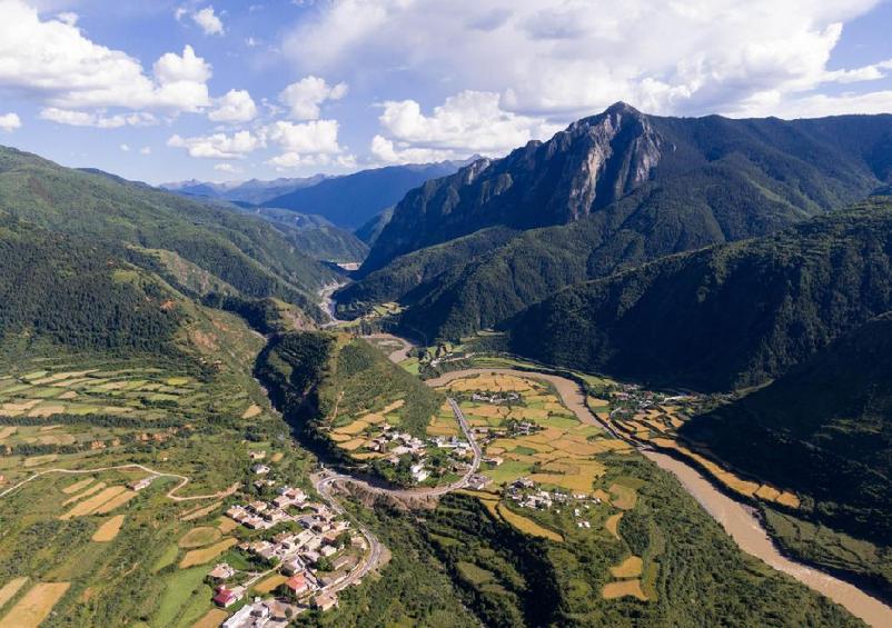 在道孚縣瓦日鄉(xiāng)瓦日村,俯瞰鮮水河谷兩岸的風光(7月23日攝,無人機照片)。新華社記者 江宏景 攝