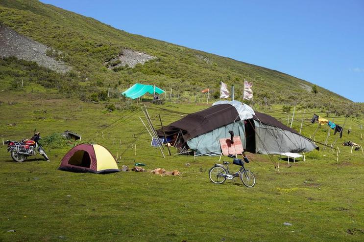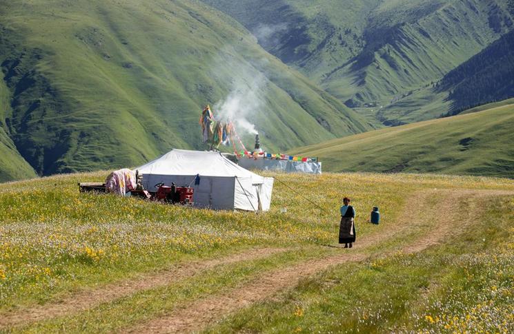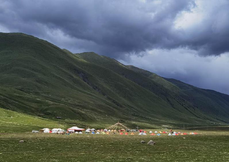 7月25日,在道孚縣龍燈草原,藏族群眾搭起帳篷休閑。新華社記者 江宏景 攝