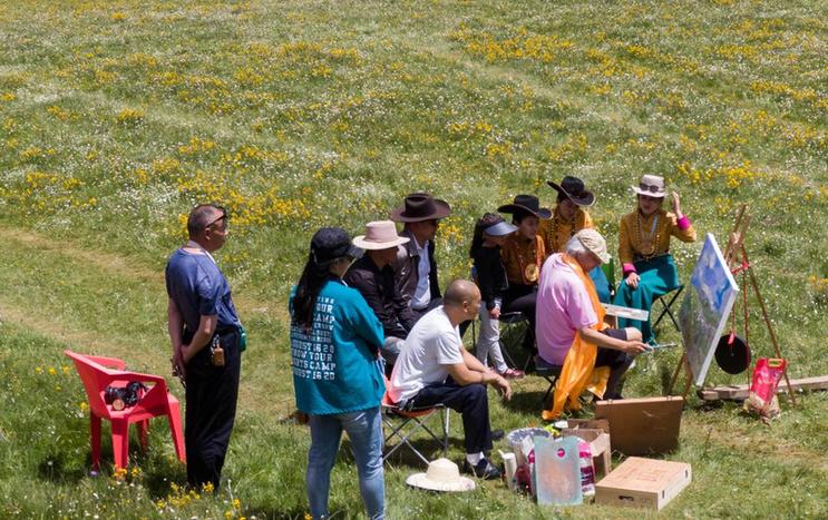 7月22日,在道孚縣玉科大草原,一名畫家在花海里創(chuàng)作油畫,吸引了當?shù)啬撩窈陀慰蛧^。新華社記者 江宏景 攝