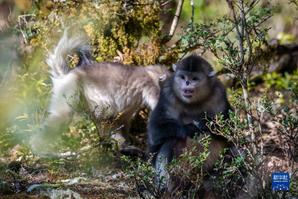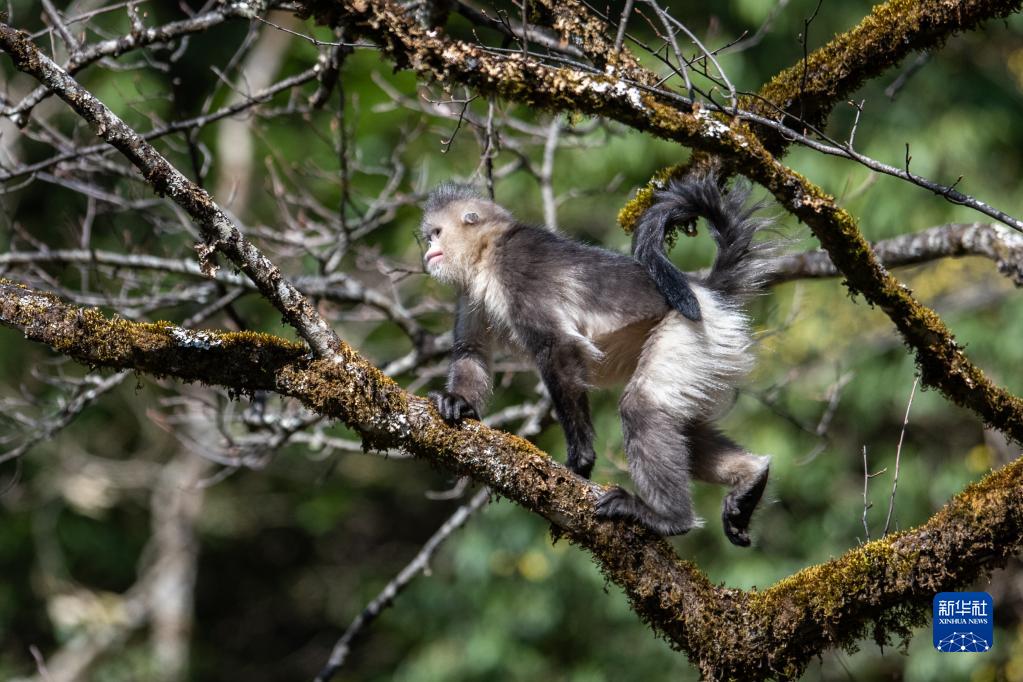 云南迪慶藏族自治州香格里拉滇金絲猴國家公園里的滇金絲猴(3月16日攝)。新華社記者 胡超 攝