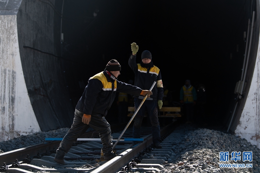 中國鐵路青藏集團公司格爾木工務(wù)段秀水河線路車間的職工在風(fēng)火山隧道口進行撥道作業(yè)。