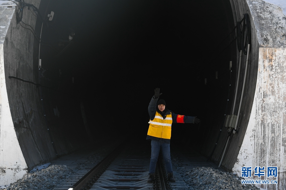 隧道內(nèi)凜冽寒風(fēng)吹得人幾乎站不住腳,呼呼的風(fēng)穿透身體。鄂年明頂著風(fēng),手拿測量工具,走走停停,還不時跪在零下三四十度的鋼面上,仔細查看線路平順情況。