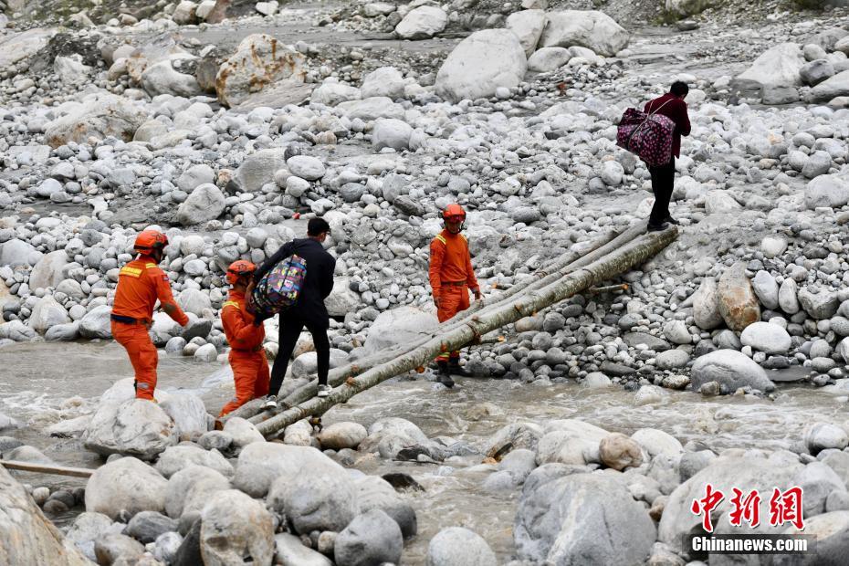 9月6日,四川甘孜州瀘定縣磨西鎮(zhèn),甘孜州森林消防支隊康定中隊隊員在木橋旁護(hù)送村民。 中新社記者 張浪 攝