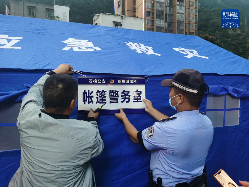 9月5日,邱建華(右一)在石棉縣受災(zāi)群眾安置點(diǎn)搭建帳篷警務(wù)室。(圖片由石棉縣公安局提供)