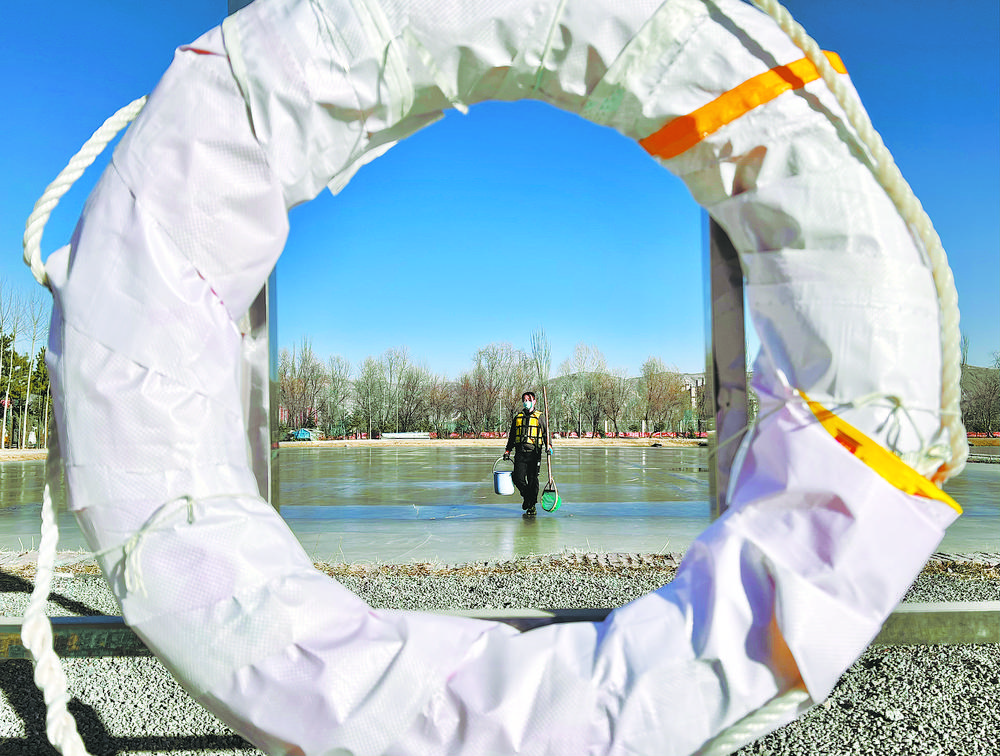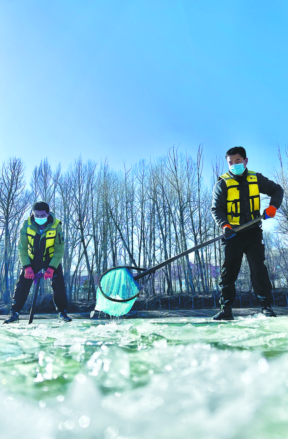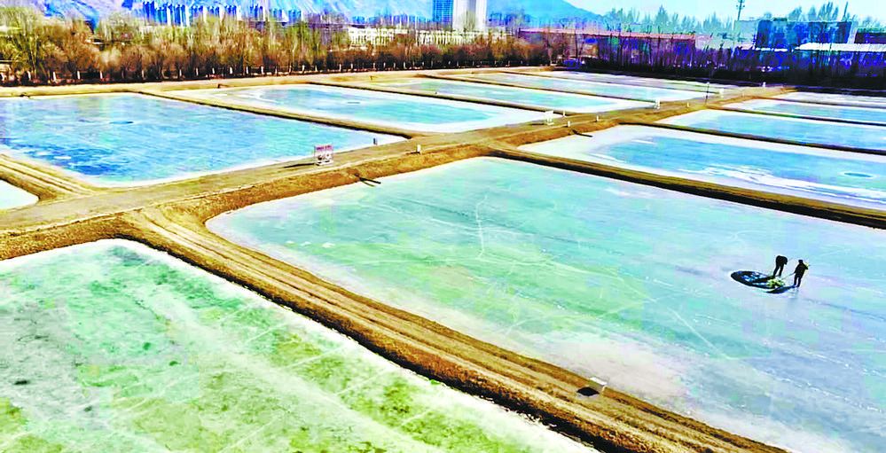 陽(yáng)光透過(guò)冰面照射在18口冰封的魚(yú)塘里,為過(guò)冬的小魚(yú)苗增氧增溫。這片池塘是裸鯉來(lái)到裸鯉救護(hù)中心的第一站,田文根是這里的一名工作人員,主要負(fù)責(zé)室外原種場(chǎng)魚(yú)苗的培育和水質(zhì)監(jiān)測(cè)工作。據(jù)他介紹,魚(yú)塘的水質(zhì)決定著魚(yú)苗的健康狀況。在冬季,及時(shí)掃雪是一項(xiàng)非常重要的工作,因?yàn)楸鶎酉旅娴穆沲庺~(yú)苗是靠浮游植物通過(guò)光合作用產(chǎn)生的氧氣生存,如果雪附著在冰層上,陽(yáng)光無(wú)法透進(jìn),就容易造成缺氧。