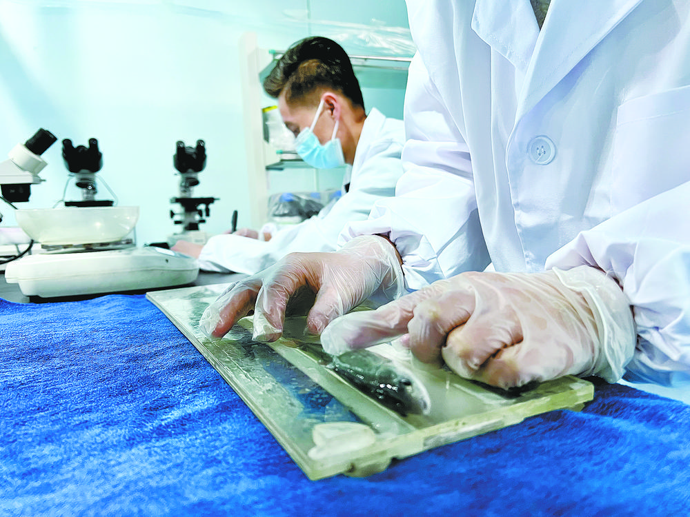 技術(shù)人員正在測(cè)量魚(yú)體的身長(zhǎng)。