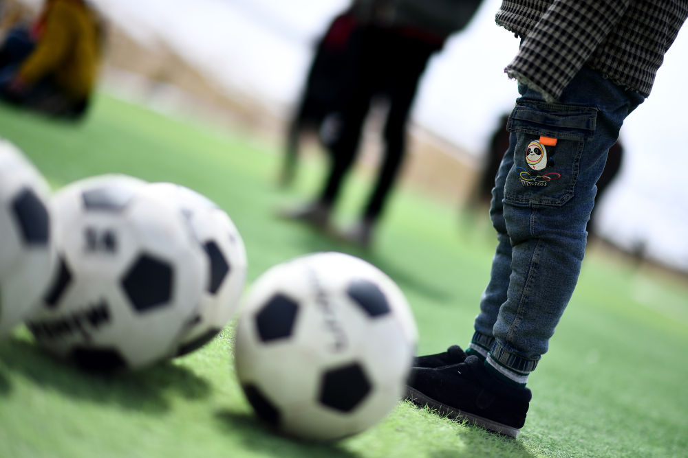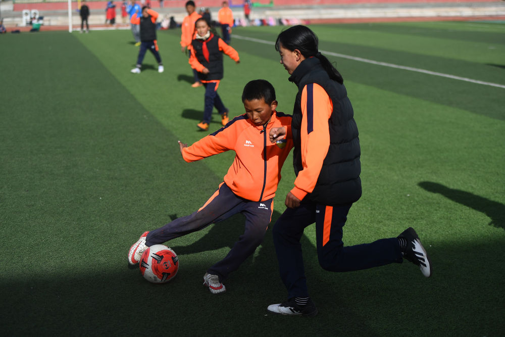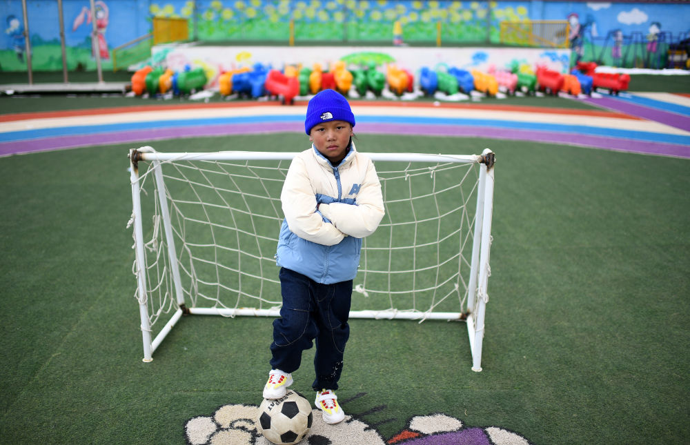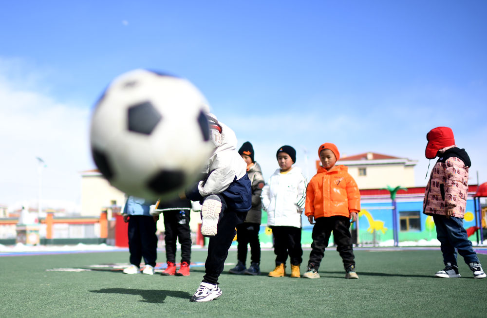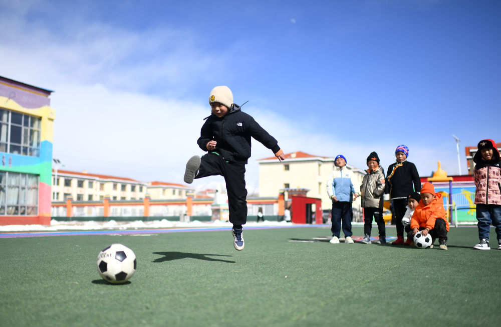 3月1日,在玉樹(shù)州治多縣,城南幼兒園小朋友桑周尼瑪(前)在練習(xí)射門(mén)。新華社記者 張宏祥 攝