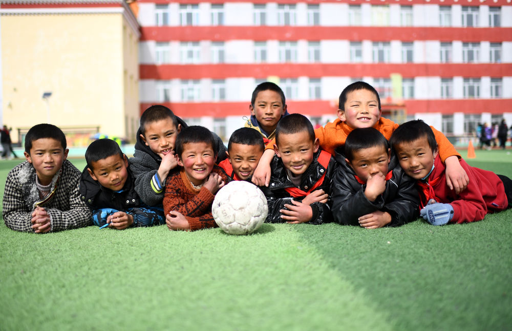 3月1日,在玉樹(shù)州治多縣,城南幼兒園小朋友在幼兒園的球場(chǎng)上。新華社記者 張宏祥 攝