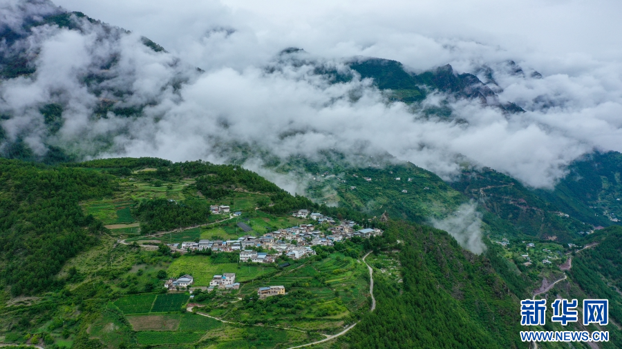 村莊與云霧繚繞的群山相映成景(7月29日攝)。新華網(wǎng) 趙普凡 攝
