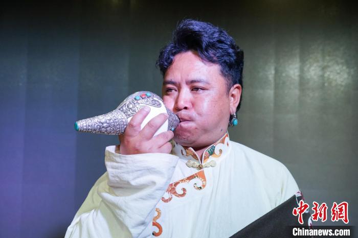 多才多藝的土旦金巴是果洛州歌舞團的主持人,也在樂團中負責吉祥海螺?!斑@是小時候舅舅教我吹的,煨桑時我們會用它祈禱、許愿?!彼榻B,“在其他地方演出時,聽到海螺聲響起,觀眾會一直鼓掌,給我很大感動,也希望將這份來自源頭的祝福傳遞給他們。”