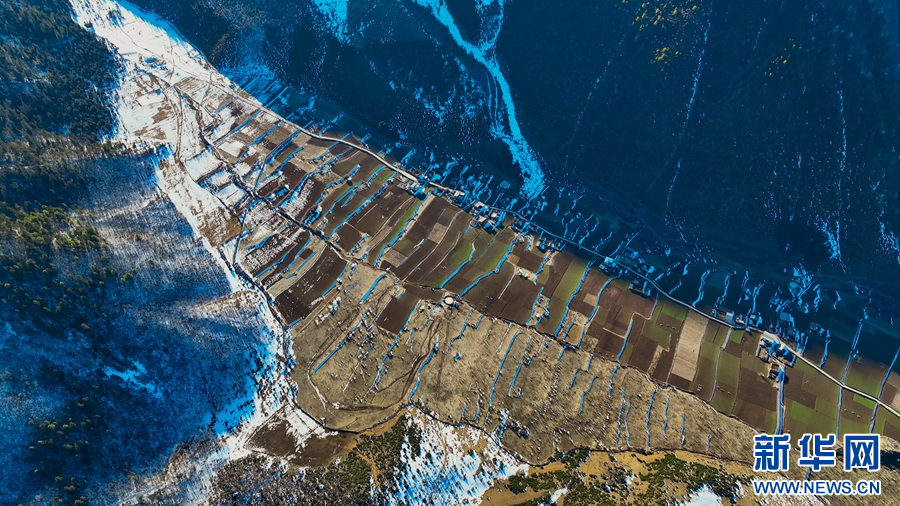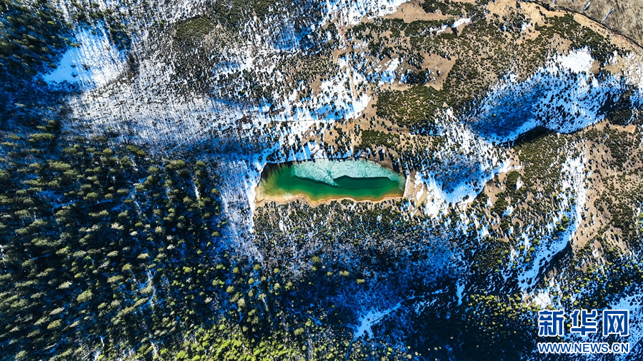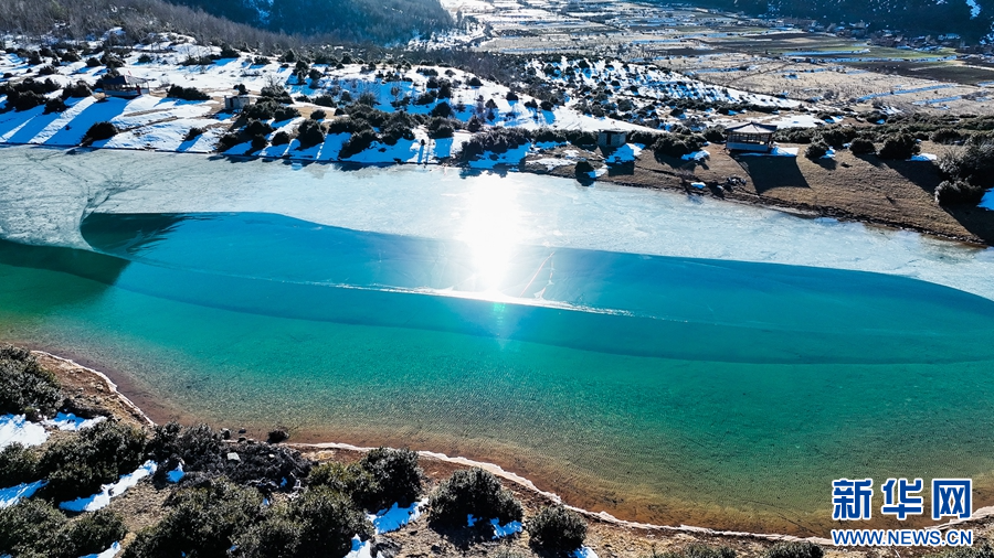 1月14日,在云南省迪慶藏族自治州德欽縣羊拉鄉(xiāng)南仁村,攝影師用無人機記錄下冬日好風光,畫面中村落被山巒環(huán)抱,山巔被皚皚白雪覆蓋,隨著鏡頭轉(zhuǎn)換,一汪翠綠的湖水映入眼簾,在陽光的照耀下,仿佛一塊翡翠。