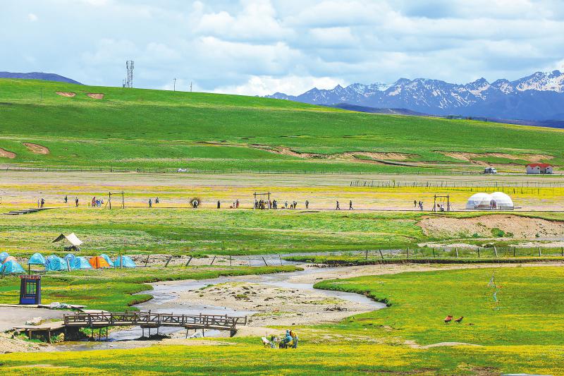 6月24日,記者一行乘車行駛在四川省阿壩藏族羌族自治州九紅草原風光路紅原段,窗外掠過一幕幕美景:草原上遍地金黃色小花,小溪蜿蜒流過花叢,遠處群山披著斑駁的“雪衣”。