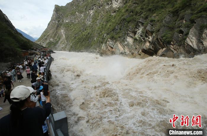 虎跳峽景區(qū)位于云南省迪慶藏族自治州香格里拉市,因猛虎躍江心石過江的傳說而得名。近日該地連續(xù)降雨,金沙江水位上漲,澎湃江水吸引游客。