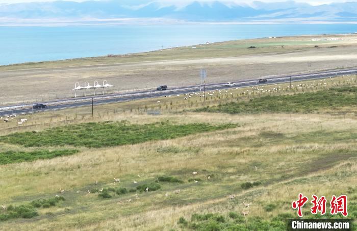 圖為普氏原羚在青海湖畔棲息覓食,悠閑愜意。(無(wú)人機(jī)照片)中新社記者 馬銘言 攝