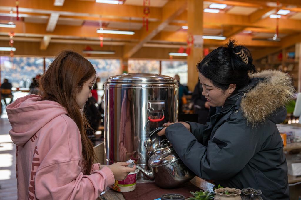 10月31日,在四川省甘孜藏族自治州稻城亞丁景區(qū),工作人員在“亞丁驛站”為游客倒熱水。新華社記者 儲(chǔ)加音 攝