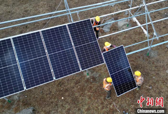 在四川省甘孜州道孚縣亞日“1+N”項(xiàng)目Ⅰ標(biāo)500MW光伏電站現(xiàn)場,工人給支架上安裝光伏板。王磊 攝